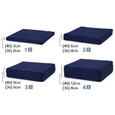 クッションを重ねることによって、座面の高さを36の場合は2・4・6・8センチより、 40の場合は3・6・9・12センチより座面高を「選択」できます。