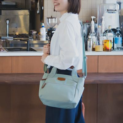 超軽量で撥水加工済みのナイロン素材。マット感がおしゃれで、ポイントになる部分は牛革で仕上げました。普段使いや手軽にお出かけ時に便利なサイズ感、マチが広く収納力があります。ブラックはチャコール系で温かみのある色合いです。グリーンはクリーミーな色合いで爽やかです。