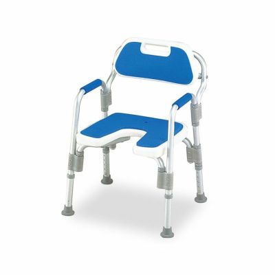 コンパクトに折り畳みが可能な座面がU字型タイプの背もたれひじ掛け付きシャワーチェアです。