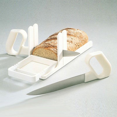 パンやハムなどをトレイで固定し、切りたい幅にガードレールを合わせると均等に切れます。
