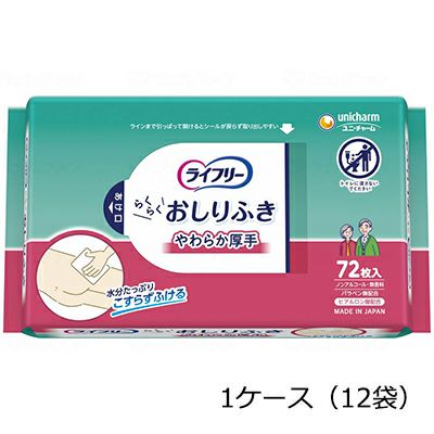 丈夫な素材でしっかり拭ける破れにくいタイプのおしりふきです。 お得な1袋72枚入り×12袋の1ケースでの販売です。 ※トイレには流せません。