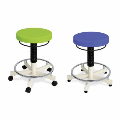 座高の調節がどの位置からでも自由におこなえるうえ、円形の足置きのついた、施術やリハビリの邪魔にならないコンパクトな施術・診察椅子です。