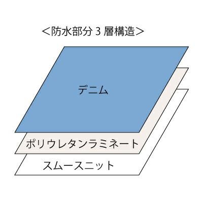 表面デニム、ポリウレタンフィルム、裏面スムースニットの3層構造。より繰り返しの洗濯に強く、耐久性に優れています。