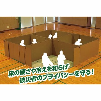 ■災害時に大活躍、被災者の生活を確保します。 ■床の方さや冷えを和らげ、被災者のプライバシーを守ります。 ■PP畳は3つ折り可能でコンパクトに収納できます。軽量で持ち運びも楽々。 ■置き畳を床に置き、段ボールを組み立てるだけで自分のスペースが出来上がります。 ■間仕切り部は段ボールで軽量なので女性の方でも簡単に設置ができます。 ■数セットを組み合わせれば、広さも自由に調節できます。 メーターモジュールだからスペース配分の計算も簡単です。 ■表地にはポリプロピレン(PP)を細いパイプ状にして織り込んだ生地を使用しています。 置き畳の表生地のPPは強度が高くしっかりとしていて、汚れても表面を水拭きできます(清潔に使用可能)。 耐久性のあるPPなので長期保管にも適しています。 ■中材に弾力性のある15mm厚の固わたを使用、硬い床の上でもクッション性あり快適に過ごせます。