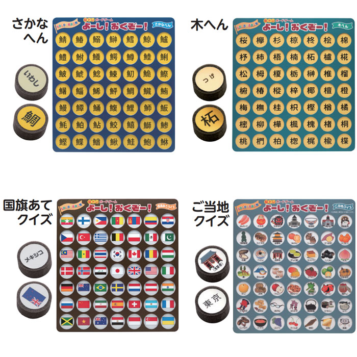 さかなへん、国旗あてクイズ、木へん、ご当地クイズの4タイプから3つお選びください。