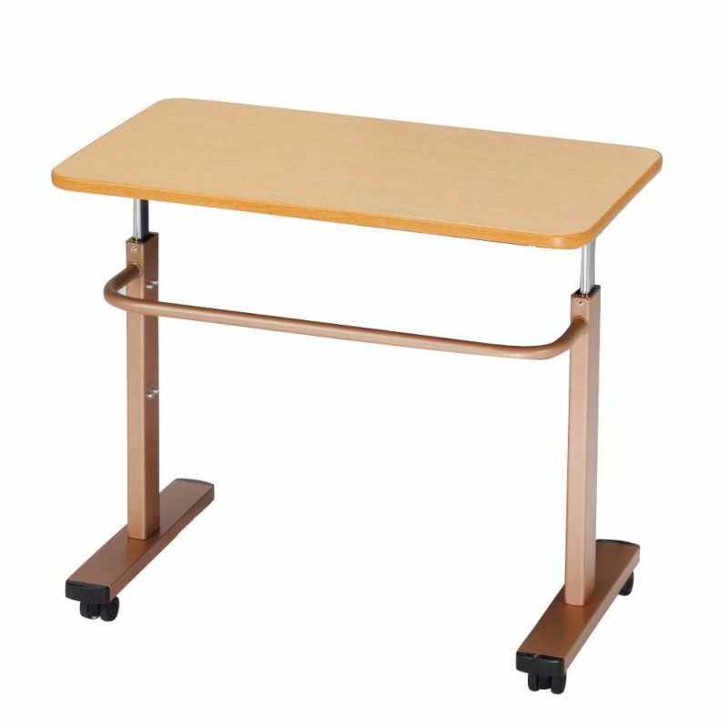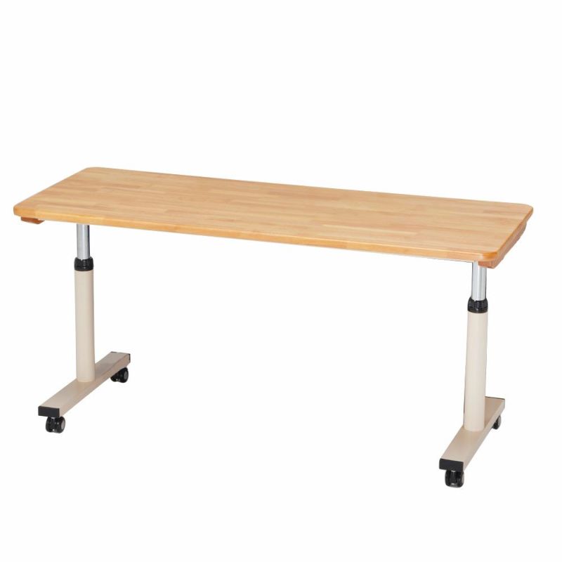 車椅子対応の昇降式リハビリテーブルです。天板の高さが変えられ、また補強バーがないため足入れの邪魔にならないので車イスの利用が可能です。