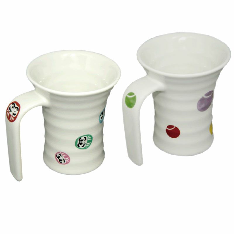 飲み口が広がっているから、あごが上がらず飲みやすいです。嚥下訓練にも最適。取っ手は5本の指で掴める安定感タイプです。