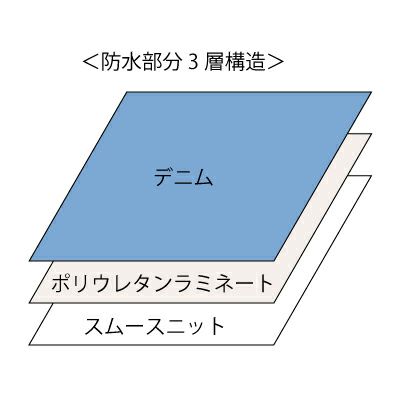 表面デニム、ポリウレタンフィルム、裏面スムースニットの3層構造。より繰り返しの洗濯に強く、耐久性に優れています。