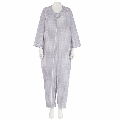 フドーねまきB 上下続き服(介護つなぎパジャマ)は、寝たきりの方を介護がしやすいよう素材と機能にこだわっています。首元から右足首にかけて開き、股部分も開閉可能な使いやすいシンプルなデザインです。