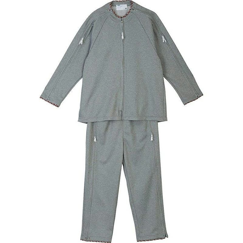 上着に3本、ズボンに2本のファスナーが付いて、開閉が自在にできる介護パジャマです。