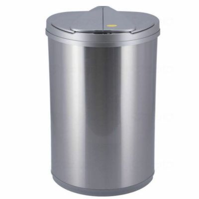 上本体はステンレスでスッキリ清潔感のあるダストボックスです。 壁が当たる面は平になっていてスッキリとしています。場所をとりません。 電池式で手を使わずに自動開閉します。