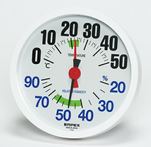 温度と湿度を確認でき、風邪や熱中症の予防ができます。アナログ式で電池不要。