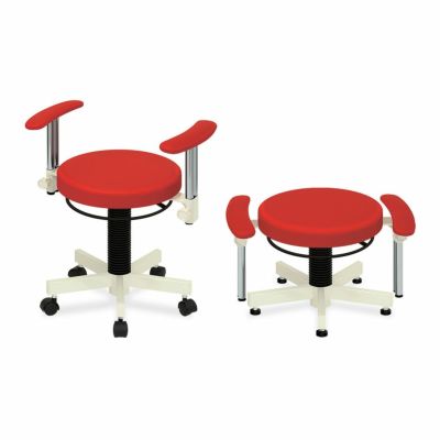 座高の調節がどの位置からでも自由におこなえるうえ、肘置きの高さも調節可能な、施術やリハビリの邪魔にならない、コンパクトな施術・診察椅子です。