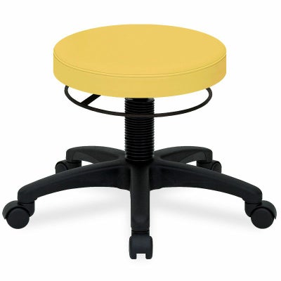 リング式レバーは座位の向きに関係なく高さ調整ができます。 安定性の高い樹脂製の5客ベースです。 ガスシリンダー式昇降機能がついています。 耐久性の高い直径5cmのキャスターが採用されています。 360度回転式座面なのでどの方向からでも座る事ができ、診察の際なども立ち上がる必要がありませんね。