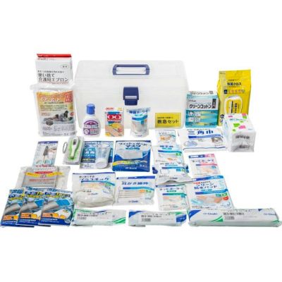 滅菌ガーゼM(10枚入)×1、カットガーゼ(15枚入)×1、サージカルテープ×1、伸縮包帯(4.5m)×1、ネット包帯(指用)×1、ネット包帯(ひじ用)×1、ネット包帯(ひざ・太もも用)×1、絆創膏(36枚入)×1、防水パッドM(3枚入)×1、三角巾×1、副木(上肢用)×1、副木(指用S)×1、副木(指用M)×1、清浄綿(25包入)×1、カット綿(55g)×1、スキニーエイド(消毒液)(80ml)×1、綿棒(50本入)×1、綿手袋×1、冷却ジェルシート(4枚入)×3、毛抜き×1、はさみ×1、体温計×1、不織布マスク(5枚入)×1、環境除菌クシート(100枚入)×1、手指の消毒ジェル(60ml)×1、使い捨て手袋(10枚入)×1、使い捨てエプロン(5枚入)×1、緊急時保温シート×1、エア-マット×1、ケース×1、セット内容リスト×1