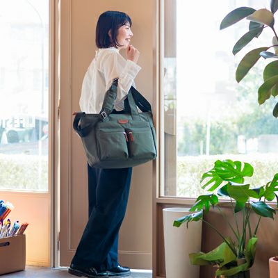 トートバッグから斜めがけ(肩掛け・ショルダー)、リュック、前抱え(前掛け・前バッグ)、メッセンジャーへと自由自在に変身し、シーンに合わせた使い方が可能。肩こりやなで肩、腰痛、足のケガ時にも負担の少ない掛け方ができるのもポイント。