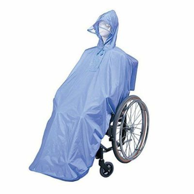 車椅子用レインコート ケアーレインは、タイヤに巻き込みにくいゴムがついていて雨の吹き込みを遮断する車いす用のレインコートです。
