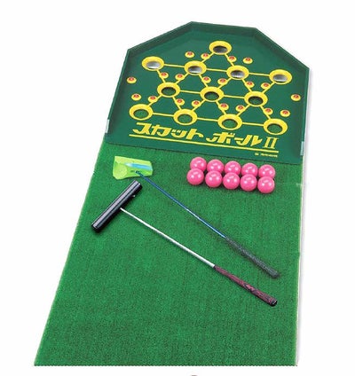 押し出し角度自在のクラブにてボールを転がし、12個のホール穴の開いたゲーム板にボールを入れ、ラインに沿って並べるゲームです。