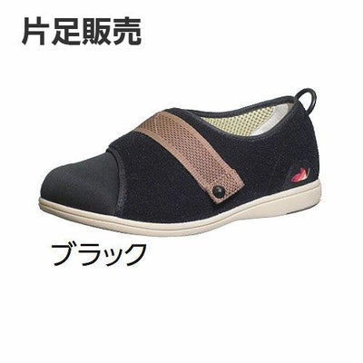 リハビリシーンも想定した、室内、室外どちらでも履ける軽量設計のシューズです。 靴形状はつま先が上がった「つまずき防止」設計になっています。 はき口を大きく広げられるので、むくみのある方でも着脱が楽にできます。 中敷を外してサイズ調整できます。 踵にやわらかい樹脂リングが付いていて、リングを引っ張りながら履くと楽に履くことができます。 足囲4Eで広めでゆったりしています。 21~28cm の片足販売です。