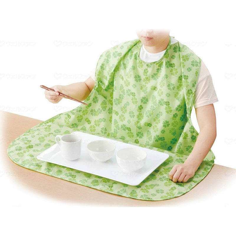 テーブルの上にセットしてもすべりにくい食事用エプロンです。食事の際の食べこぼしから衣類を守ります。