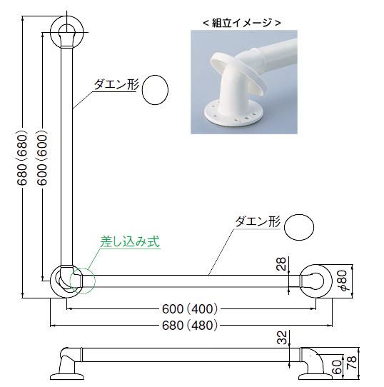 室内用補助手すり どこでも手すりダエン形 L型600×400・600 BR-284は、抗菌樹脂コーティングで、浴室・トイレ・廊下・玄関どこでも取り付け可能!