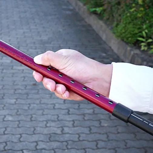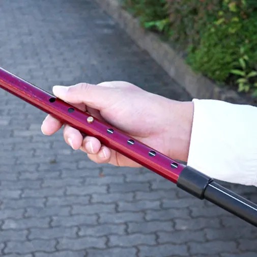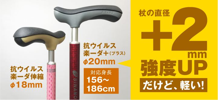 抗ウイルス楽―ダ伸縮 と比較して杖の直径が2mmアップ! 強度が大きく高まり、ご使用者の身長目安も156~186cmまでと幅広く皆様にお使いいただけるようになりました。 重量約260gととっても軽く、長時間の使用も疲れにくい、見た目を裏切る軽量ボディが特徴です。
