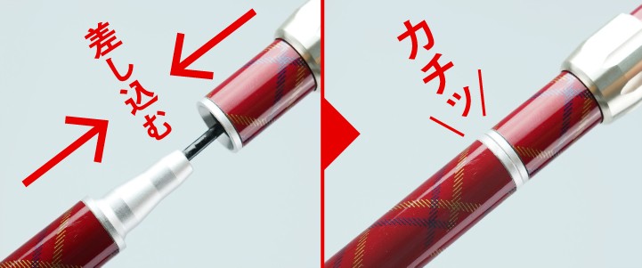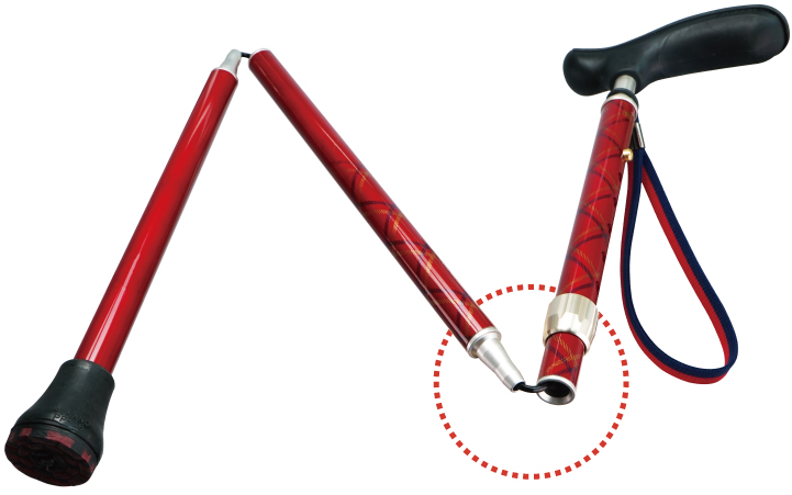組み立ては、畳んだシャフトを真っ直ぐに差し込むだけ。カチッという音とともに繋ぎ目が固定されるから、杖を組み立てるときもわかりやすく簡単です。
