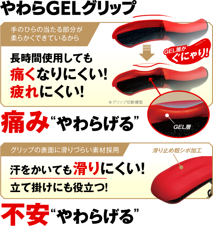長時間杖を使用した際や、杖に体重をかけている場合に起こりやすい「握り疲れ(手のひらの疲労や痛み・腕の疲労など)」。これらの悩みを解消する「やわらGELグリップ」を採用。