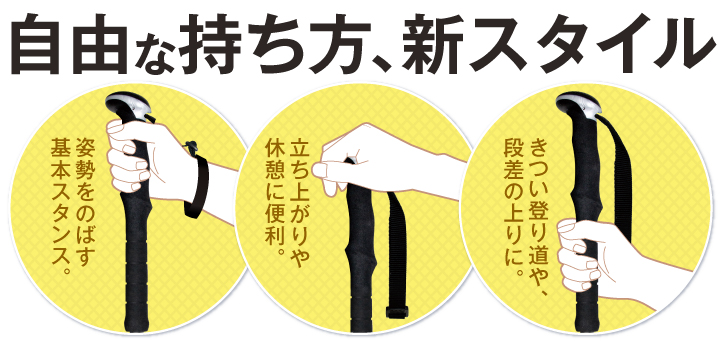 山登りのトレッキングポールに採用されているものと同じグリップを杖に初採用。