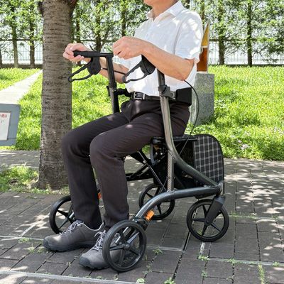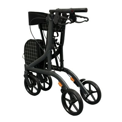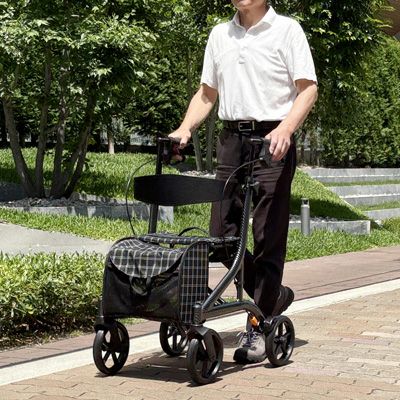 ブラックを基調としたシックなデザインの步行車です。 フレーム塗装は上質感のあるカーボン調ブラック。フレーム構造は「ダブルクロスバー」を採用し、横揺れ・縦揺れに強く、歩行バランスの悪い方も安心・安全にご使用いただけます。