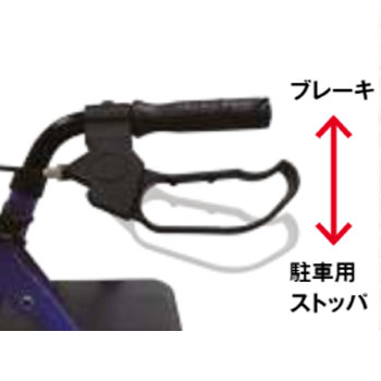 2WAYブレーキ ブレーキ・ストッパの一体型システム。レバーを握るとブレーキ、押し下げると駐車用ストッパがかかります。